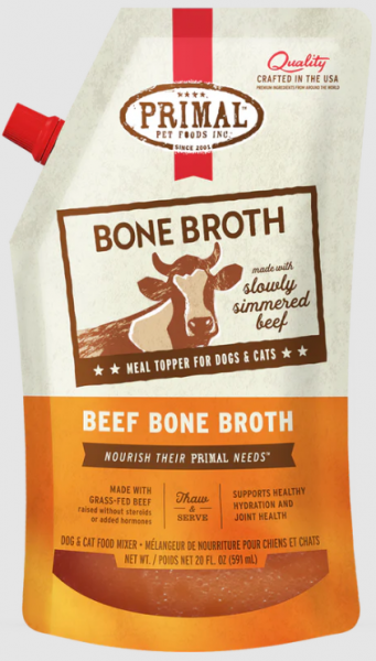 Bone Broth is a wholesome addition to any feeding regimen. When served on its own, added to commercial pet food, or along with any complete, balanced Primal Formula, Bone Broth adds necessary moisture and beneficial nutrients into your pet’s diet. With key benefits including digestion and liver support, hydration and moisture, joint health, and more, supplementing with Bone Broth is an easy way to keep your pet hydrated and healthy. Primal Bone Broth is appropriate for dogs and cats at all stages of life.