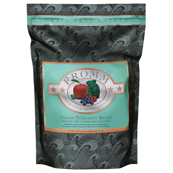 Fromm Four-Star Nutritionals Grain Free Salmon Tunachovy Dry Cat Food is an enticing grain-free blend of wild salmon, tuna, and anchovy together with fresh tomatoes, spinach, zucchini, eggplant, and olive oil. Created to give cats a gourmet dining experience, this artisan recipe is prepared in small batches, ensuring consistency, quality, and superior taste in each and every bowl. It provides complete and balanced nutrition to cats of all ages, and it can be alternated with other Fromm Four-Star recipes, offering a flavorful meal on its own or when mixed with canned food.