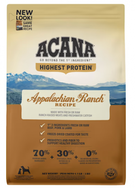 ACANA Appalachian Ranch Dog recipe is formulated to meet the nutritional levels established by the AAFCO Dog Food Nutrient Profiles for All Life Stages except for growth of large size dogs (70 lb or more as an adult).