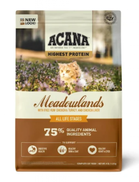 Your cat is an obligate carnivore, biologically requiring a diet rich in protein from quality animal ingredients. ACANA Meadowlands offers quality animal ingredients from free-run chicken and turkey, freshwater fish, and cage-free eggs. Protein-rich and nutrient-dense, ACANA includes WholePrey ratios of meat, organs, cartilage, and bone, so your cat is getting everything they need for peak health along with a delicious flavor they’ll crave, keeping them happy, healthy, and strong.