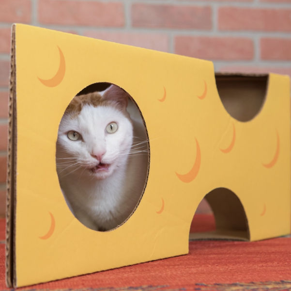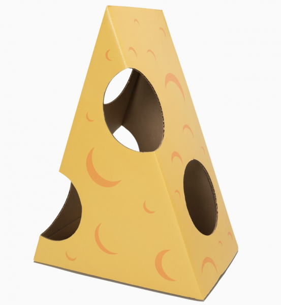 Is there a very large mouse hiding in that ginormous wedge of cheese? I think your cat needs to find out. And if not, it might be just the place for a cozy snooze. Assembled, the Monster Cheese Wedge Box is approximately 22" long, 16" wide and 10" deep. Holes are approximately 6.5" in diameter. Monster Cheese Wedge is imprinted with cat-safe soy inks, and is eco-friendly, made of recycled cardboard. Made in the USA.
