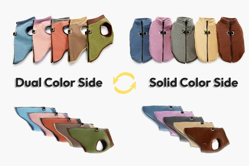 2-in-1 Reversible Design! Two plush fleece layers work together to trap body heat and create a soft, insulating barrier that keeps your dog warm and comfortable from morning walks to evening cuddles. Flip it inside-out to match your mood or outfit—two completely different looks in one jacket means more variety without buying multiple coats. Reversible D-rings that slip through on both sides mean you never have to detach when flipping to other side. Just flip the jacket and go. Strong and secure leash rings that are held together with one long inner strap that wraps around the dog’s chest as well as reinforced stitching.