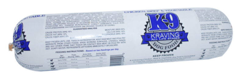 K-9 Kraving Chicken, Beef & Vegetable raw dog food is a Complete & Balanced diet "For all life stages." K-9 Kraving raw dog food supplies the vitamins, minerals and trace minerals essential to the overall health of a canine.