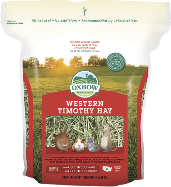 Oxbow’s all-natural Western Timothy Hay is a nutritious, sweet-smelling grass that will stimulate the appetite of your rabbit, guinea pig, chinchilla, or other small pet. Western Timothy is the #1 vet-recommended hay for small herbivores.