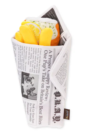 - Detachable crinkly fish and squeaky fries wrapped in a soft, playful newspaper that are perfect for fetch, chomps and curious chewers