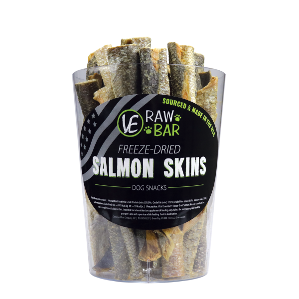 Vital Essentials Freeze-Dried Salmon Skins are a great source of Omega 3 Fatty Acids to help promote a healthy skin and coat. All Vital Essentials snacks support healthy teeth and gums and are a nutritious and delicious way to feed your pet between meals.