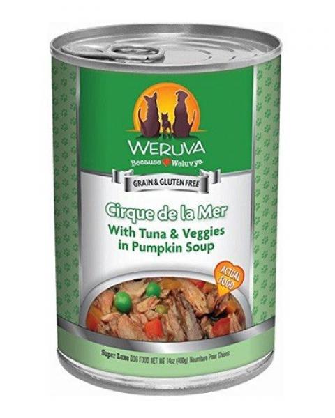 For all the tuna lovers out there, especially the allergy sensitive... who says you have to compromise taste! Enjoy our chunks of whole meat wild caught tuna mixed with sweet potatoes, green peas and carrots in a pumpkin soup... Cirque de la Mer... Circus of the Sea!
