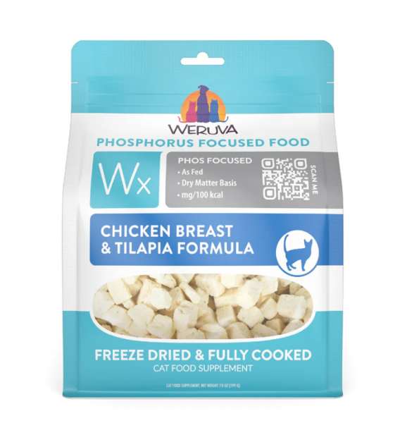 Featuring naturally low phosphorus proteins like boneless, skinless white breast meat chicken, tilapia and egg whites, Weruva's fully cooked freeze dried formula is designed for high palatability while helping to maintain muscle mass. With up to 50% less phosphorus than AAFCO’s minimum levels, Weruva Wx Phos Focused formulas are intended for intermittent or supplemental feeding, providing essential nutrition for cats in need.